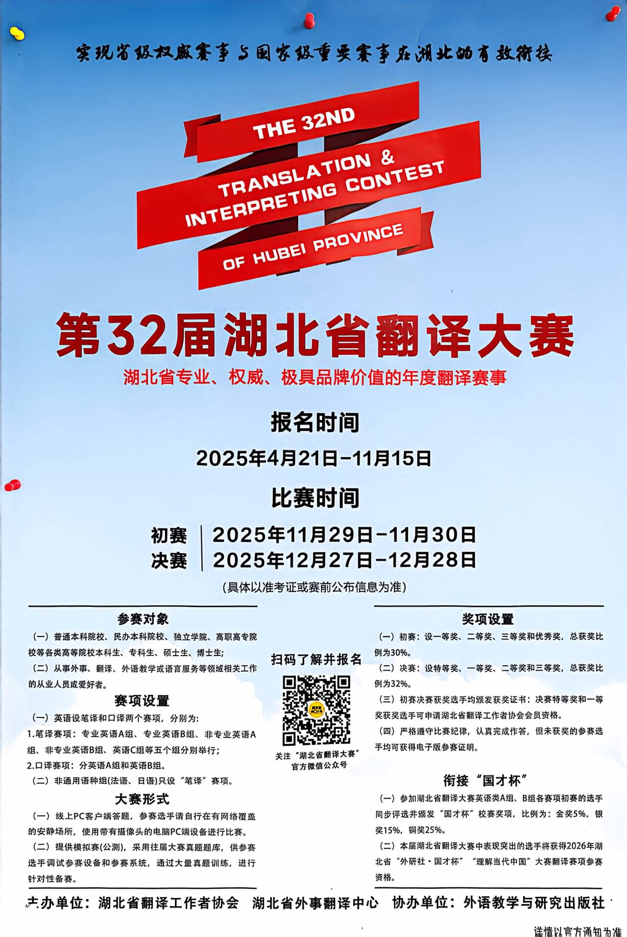 11月23日意昂体育第二十届科技文化节英语翻译大赛和11月29日第32届湖北省翻译大赛初赛如期举行。两场比赛涵盖政治、经济、文化、科技等多个领域,不仅深度检验了参赛者的语言能力,更全方位锤炼了其跨文化交际素养。一篇篇精心打磨的译文,尽显参赛选手独树一帜的理解视角与表达才华,为整场赛事注入鲜活而亮丽的色彩。